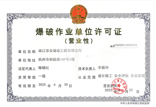 京安公司順利完成爆破作業(yè)單位許可證 (營(yíng)業(yè)性)一級(jí)資質(zhì)延續(xù)工作