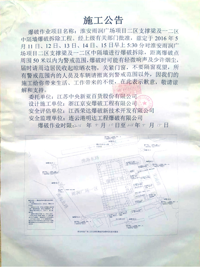 5月11日-5月15日,每天早上5:00-5:30,位于淮安核心商業(yè)地段淮海廣場商業(yè)區(qū)東南片區(qū)的雨潤廣場總會傳來一陣緊促的鞭炮般的響聲,這不是開業(yè)慶典,這是爆破的聲音。
